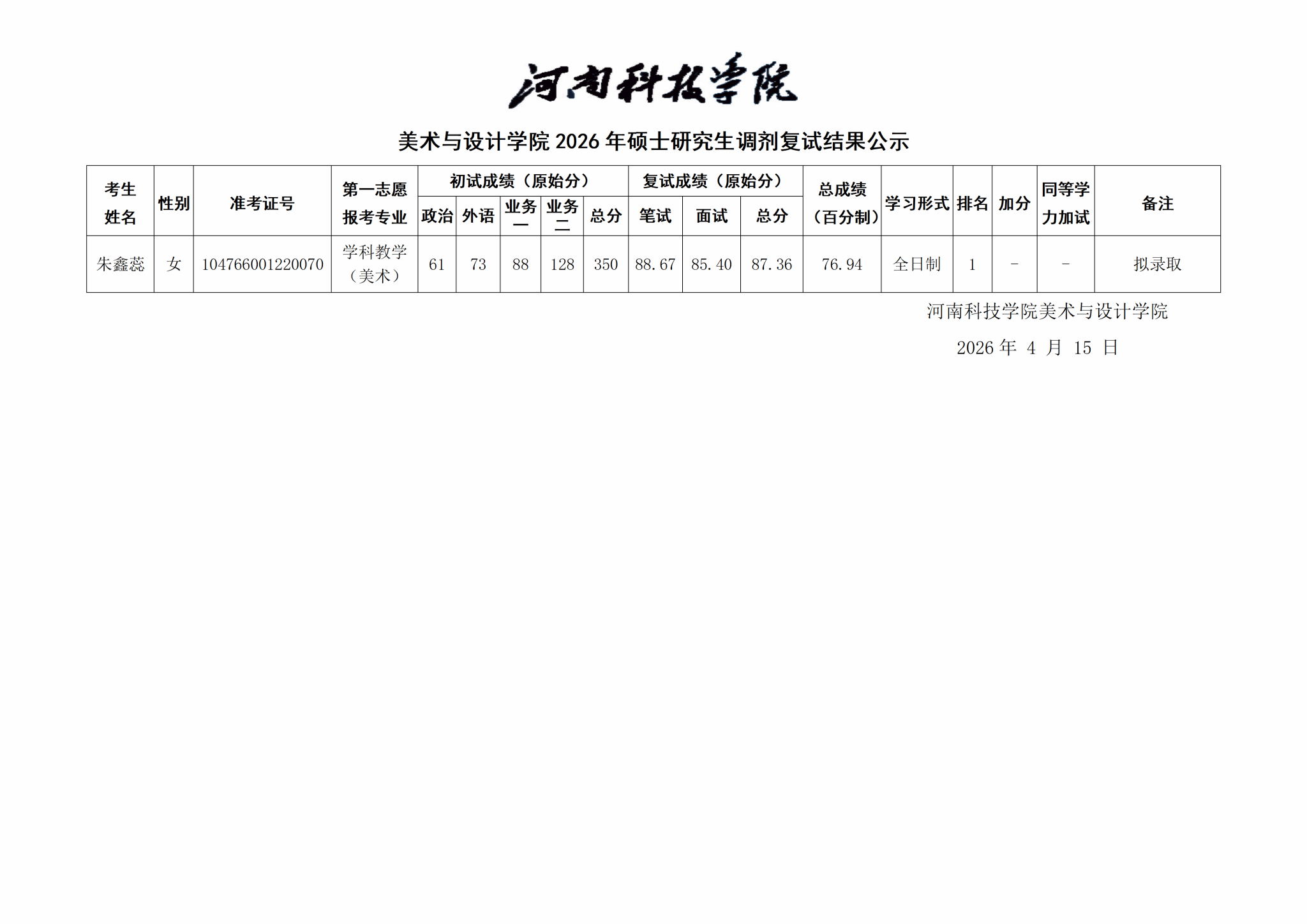 美术与设计学院2026年硕士研究生调剂复试结果公示