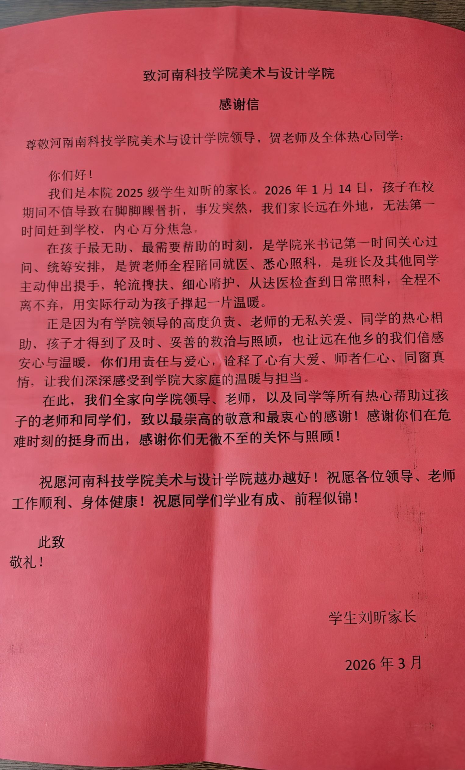 一面锦旗,承载着家长的真挚感激,更彰显着美术与设计学院“爱生如子”的育人初心。长期以来,学院始终将学生的健康成长与切身需求放在首位,从日常关怀到应急处置,全方位践行立德树人使命。未来,学院将继续传承这份师者仁心,以更细致的服务、更温暖的关怀,为每一位学生的成长成才保驾护航。