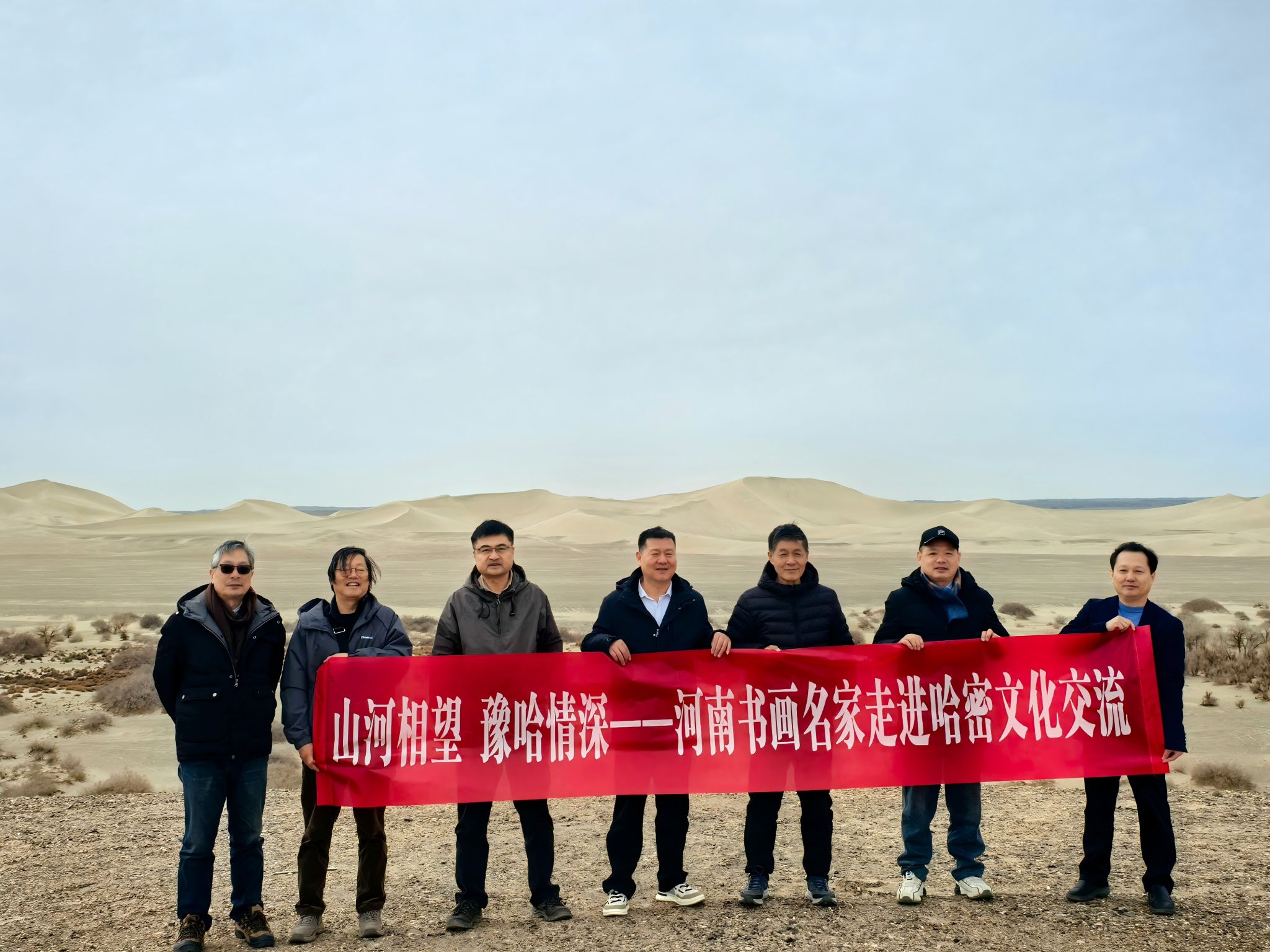 笔墨传情,文化润疆。2026年3月21日至26日,美术与设计学院张新词教授出席“山河相望・豫哈情深”——豫疆书画名家赴哈密文化交流活动。豫疆6名书画名家齐聚哈密,通过采风创作、交流笔会、艺术培训及作品展览等形式,搭建豫哈文化交流桥梁。活动期间,艺术家们探访南湖沙漠、胡杨林等自然人文景观及红色教育基地和乡村,积累创作素材并为当地群众创作作品,还走进河南对口支援新疆工作前方指挥部开展交流笔会。
