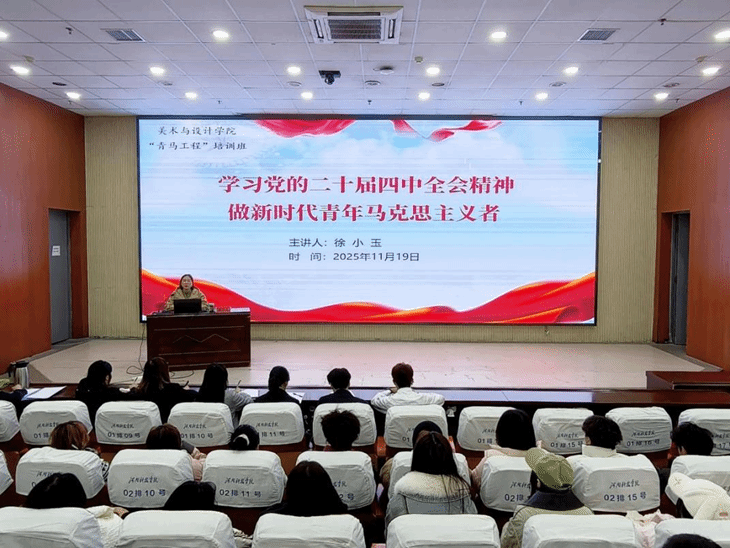 为深入学习贯彻习近平新时代中国特色社会主义思想、党的二十大精神和党的二十届四中全会精神,着力培养信仰坚定、能力突出、素质优良的青年马克思主义者和团学骨干,11月19日,美术与设计学院在图书馆学术报告厅举办2025年“青马工程”暨团学干部培训班开班仪式。学院党委副书记徐小玉,团委书记贺松涛、团委副书记杨丹、王钊及2025届团委学生会全体成员、2025级班委及宿舍长等近200人参加仪式。仪式由学生会主席团成员马仁伯主持。